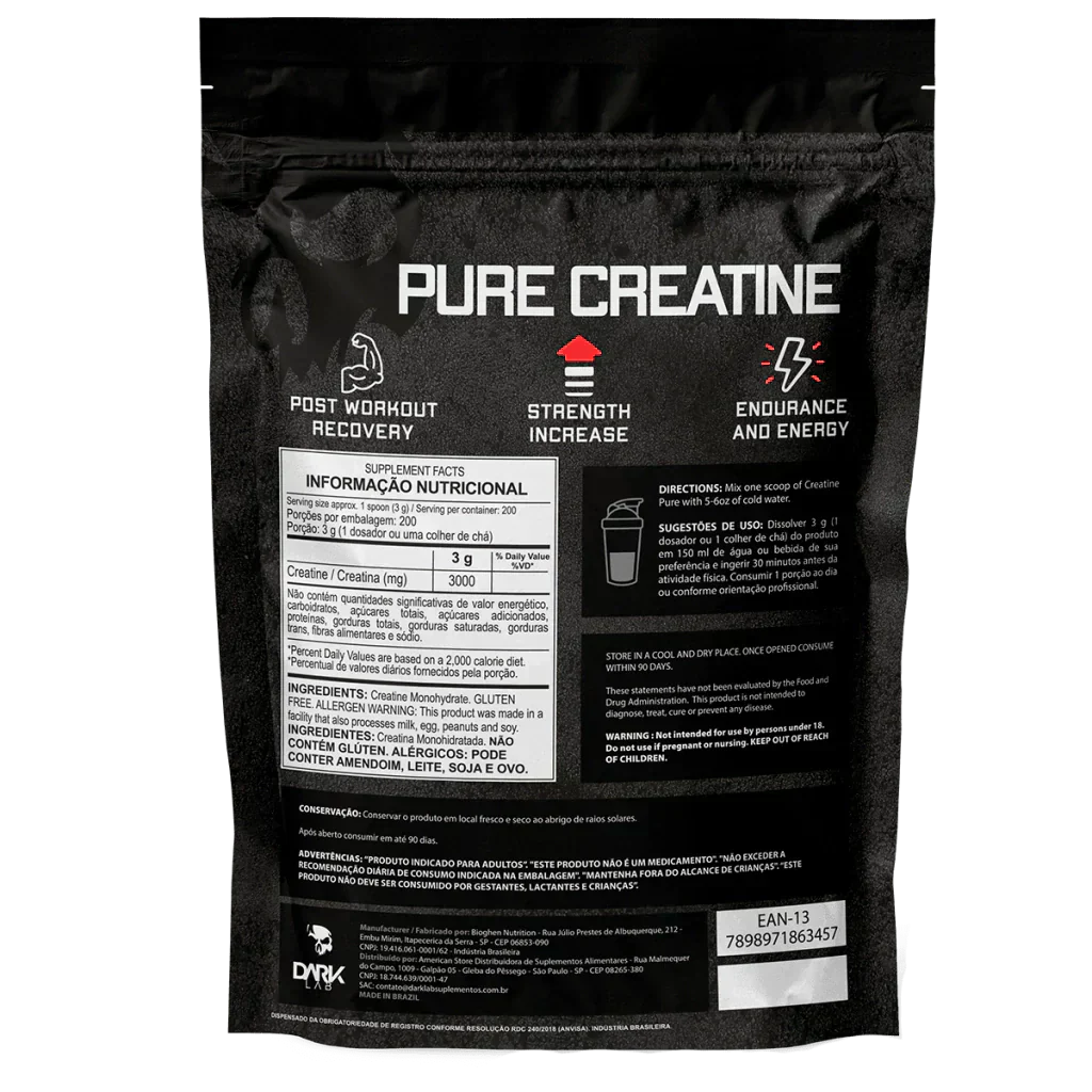 A Creatina Pura Dark Lab é a escolha número 1 para atletas e praticantes de musculação que buscam melhores resultados. Com 500g de poder puro, a Creatina Pura Dark Lab é a solução para aqueles que buscam aumentar sua força, resistência e explosão muscular. Produzida com a mais alta qualidade e pureza, a creatina é rapidamente absorvida pelo corpo, proporcionando benefícios incríveis. A creatina é um composto produzido naturalmente pelo nosso corpo e armazenado nos músculos, onde é usada como fonte de energia para atividades de alta intensidade e curta duração. Com a Creatina Pura Dark Lab, você tem a garantia da mais alta pureza do mercado, com uma variação mínima de apenas 1.9%, totalizando 98,1% de pureza na matéria-prima. Isso significa que você está consumindo a melhor creatina disponível no Brasil.