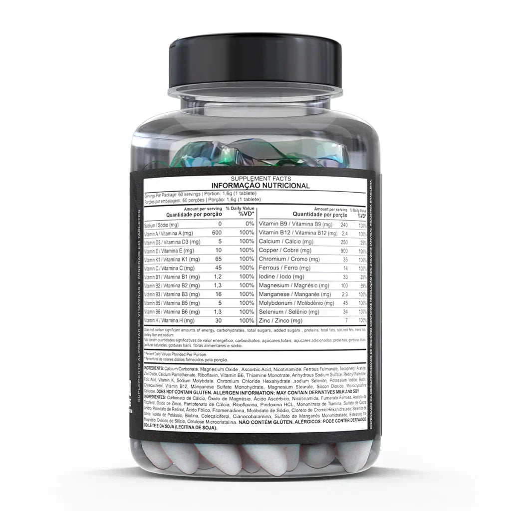 INGREDIENTES: Carbonato de cálcio, óxido de magnésio, ácido ascórbico, nicotinamida, fumarato ferroso, acetato de tocoferol, óxido de Zinco, pantotenato de cálcio, riboflavina, piridoxina HCL, mononitrato de tiamina, sulfato de cobre anidro, palmitato de retinol, ácido fólico, fitomenadiona, molibdato de sódio, cloreto de cromo hexahidratado, selenito de sódio, iodeto de potássio, biotina, colecalciferol, cianocobalamina, sulfato de manganês monohidratado, estearato de magnésio, dióxido de silício, celulose microcristalina. NÃO CONTÉM GLÚTEN.