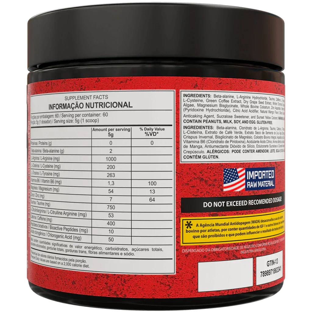 Beta-Alanina, Cloridrato de L-Arginina, Taurina, Cafeína, L-Arginina, Taurina, Cafeína, L-Tirosina, L-Cisteína, Extrato de Café Verde, Extrato Seco de Semente de Uva, Alga Chondrus Crispus Invernal, Bisglicinato de Magnésio, Colostro Bovino Integral, Aspartato de Zinco, Vitamina B6 (Cloridrato de Piridoxina), Acidulante Ácido Cítrico, Aroma Idêntico ao Natural de Manga, Antiumectante Dióxido de Silício, Edulcorante Sucralose e Corante Amarelo Crepúsculo.