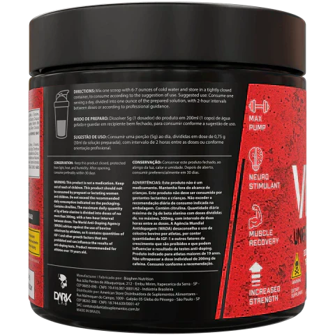 Beta alanina, L-arginina, taurina, cafeína, L-tirosina, cisteína, extrato de café verde, extrato de semente de uva, alga Chondrus crispus invernal, bisglicinato de magnésio, colostro bovino, aspartato de zinco, vitamina B6 (cloridrato de piridoxina), acidulante ácido cítrico, aroma idêntico ao natural de Fruit Punch, antiumectante dióxido de silício, edulcorante sucralose e corante vermelho ponceau.
