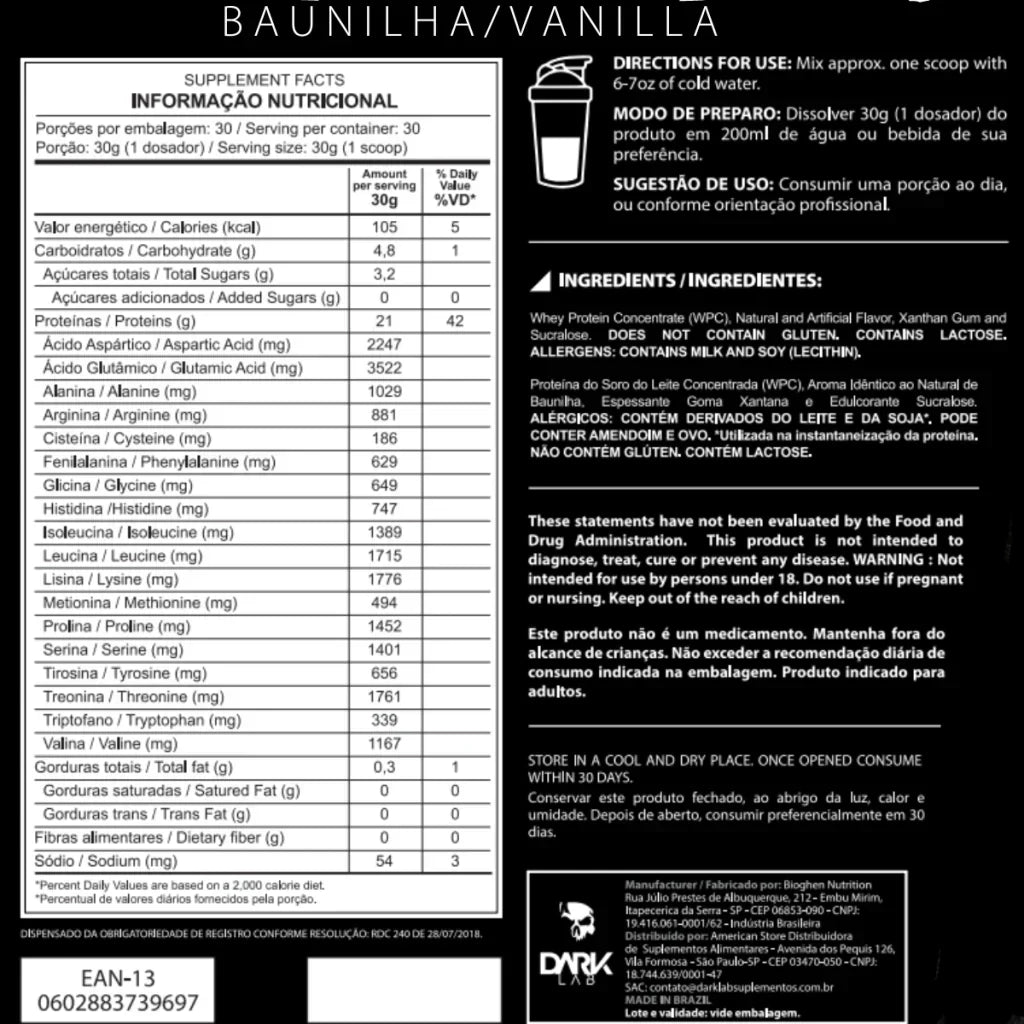 Proteína do soro de leite concentrada, aroma idêntico ao natural de baunilha, espessante goma xantana, edulcorante sucralose. NÃO CONTÉM GLÚTEN. CONTÉM LACTOSE.