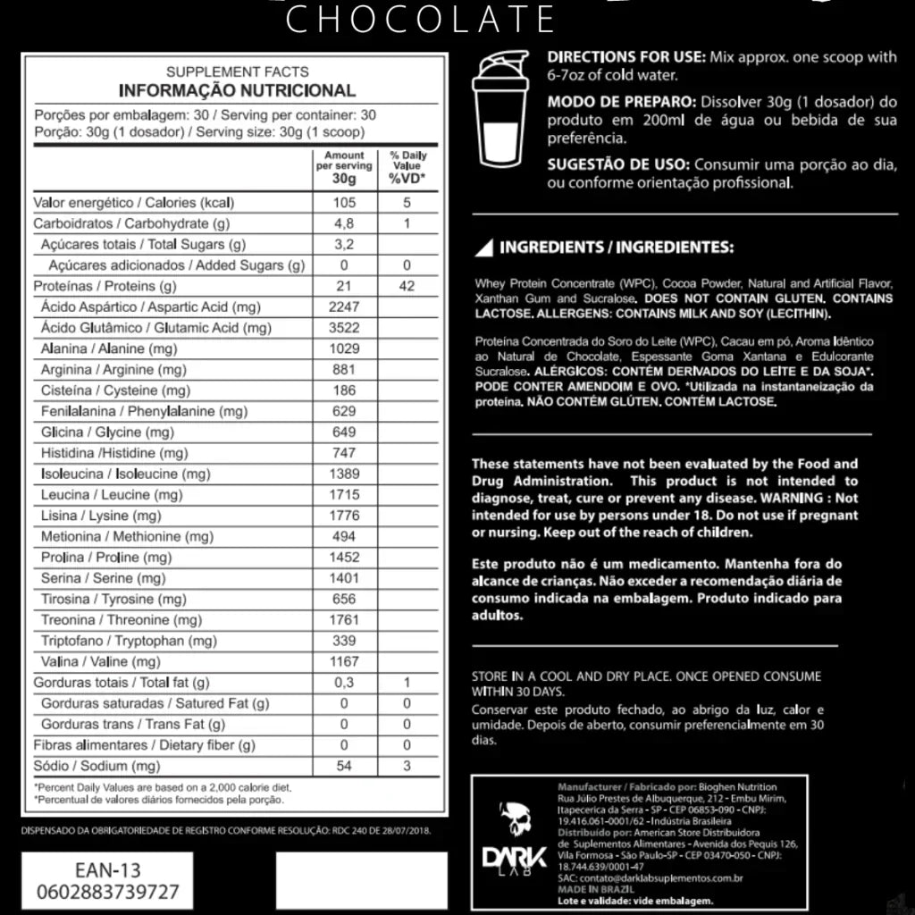 Proteína do soro de leite concentrada, cacau em pó, aroma idêntico ao natural de chocolate, espessante goma xantana, edulcorante sucralose. NÃO CONTÉM GLÚTEN. CONTÉM LACTOSE.