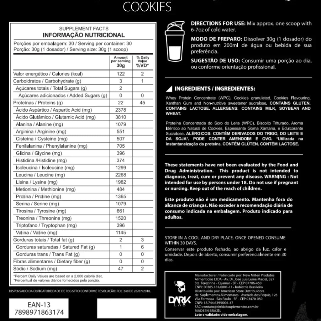 Proteína do soro de leite concentrada, biscoito de cacau, aroma idêntico ao natural de creme, espessante goma xantana, edulcorante sucralose e antiumectante dióxido de silício. NÃO CONTÉM GLÚTEN. CONTÉM LACTOSE.