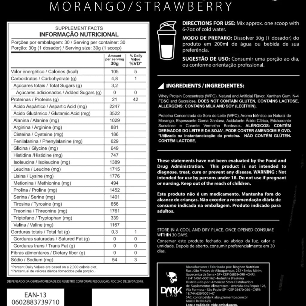 Proteína do soro de leite concentrada, biscoito de cacau, aroma idêntico ao natural de morango, espessante goma xantana, acidulante ácido cítrico, edulcorante sucralose e corante vermelho bordeaux. NÃO CONTÉM GLÚTEN. CONTÉM LACTOSE.