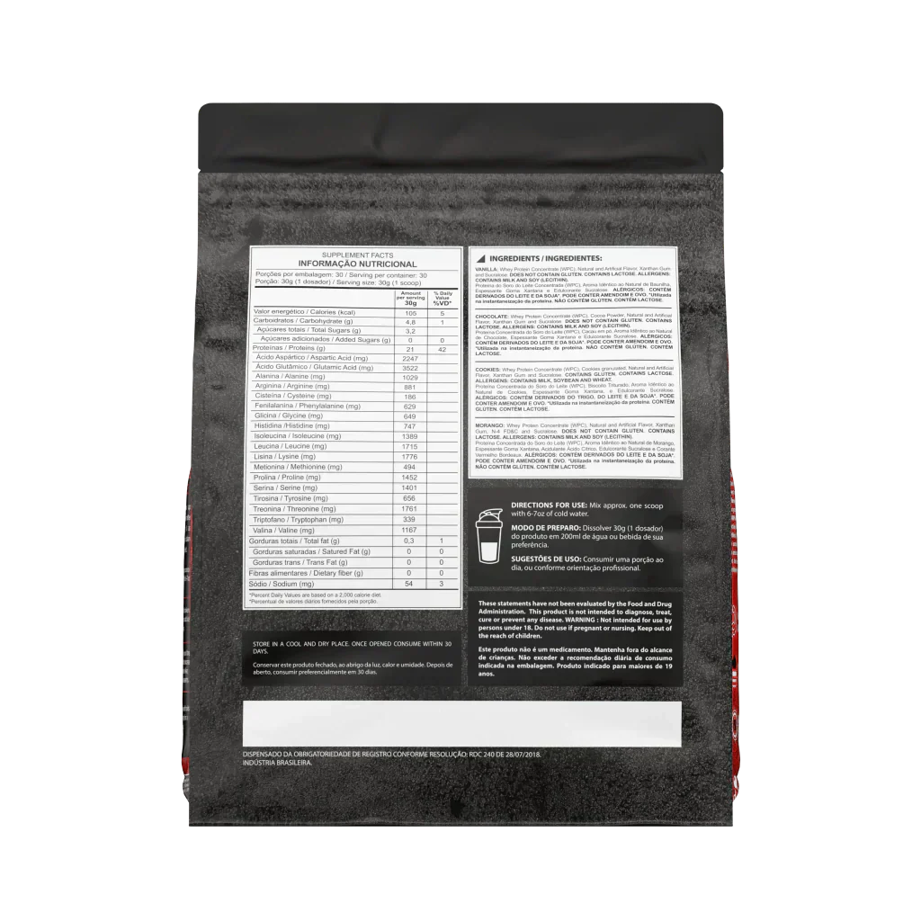 INGREDIENTES: Proteína Concentrada do Soro de Leite (WPC), Proteína Isolada de Soja, Isolado Proteico do Soro do Leite (WPI), Claro do Ovo Desidratada (Albumina) e Caseinato de Cálcio.