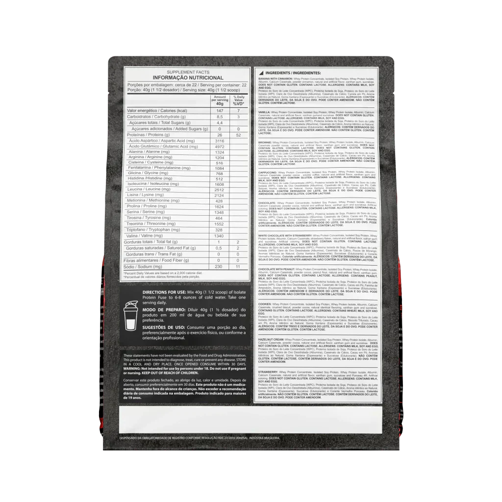 Isolate Protein Fuse é um blend proteico oferecendo um ótimo custo beneficio com 5 tipos de proteína das mais nobres disponíveis como: Proteína Concentrada do Soro de Leite (WPC), Proteína Isolada de Soja, Proteína isolada do Soro do Leite (WPI), Clara do Ovo Desidratada (Albumina) e Caseinato de Cálcio. Todas com diferentes tempos de absorção pelo organismo, garantindo assim uma adequada ingestão proteica, ajudando a construir um corpo mais forte e definido. A utilização de blend proteico, como o Isolate Protein Fuse, oferece uma variedade de benefícios para quem busca uma alimentação saudável e um estilo de vida ativo, como o aumento da saciedade, a manutenção da massa muscular, a melhoria da recuperação após os treinos, o fornecimento de nutrientes essenciais e a redução do catabolismo muscular. Além disso, Isolate Protein Fuse possui baixo teor de gordura, lactose e carboidratos, sendo uma excelente opção para quem deseja complementar a dieta com um produto de alta qualidade e eficácia. Isolate Protein Fuse é rico em BCAAs e outros aminoácidos essenciais que podem proporcionar mais energia e força, garantindo um melhor desempenho, para auxiliar no volume e definição muscular.