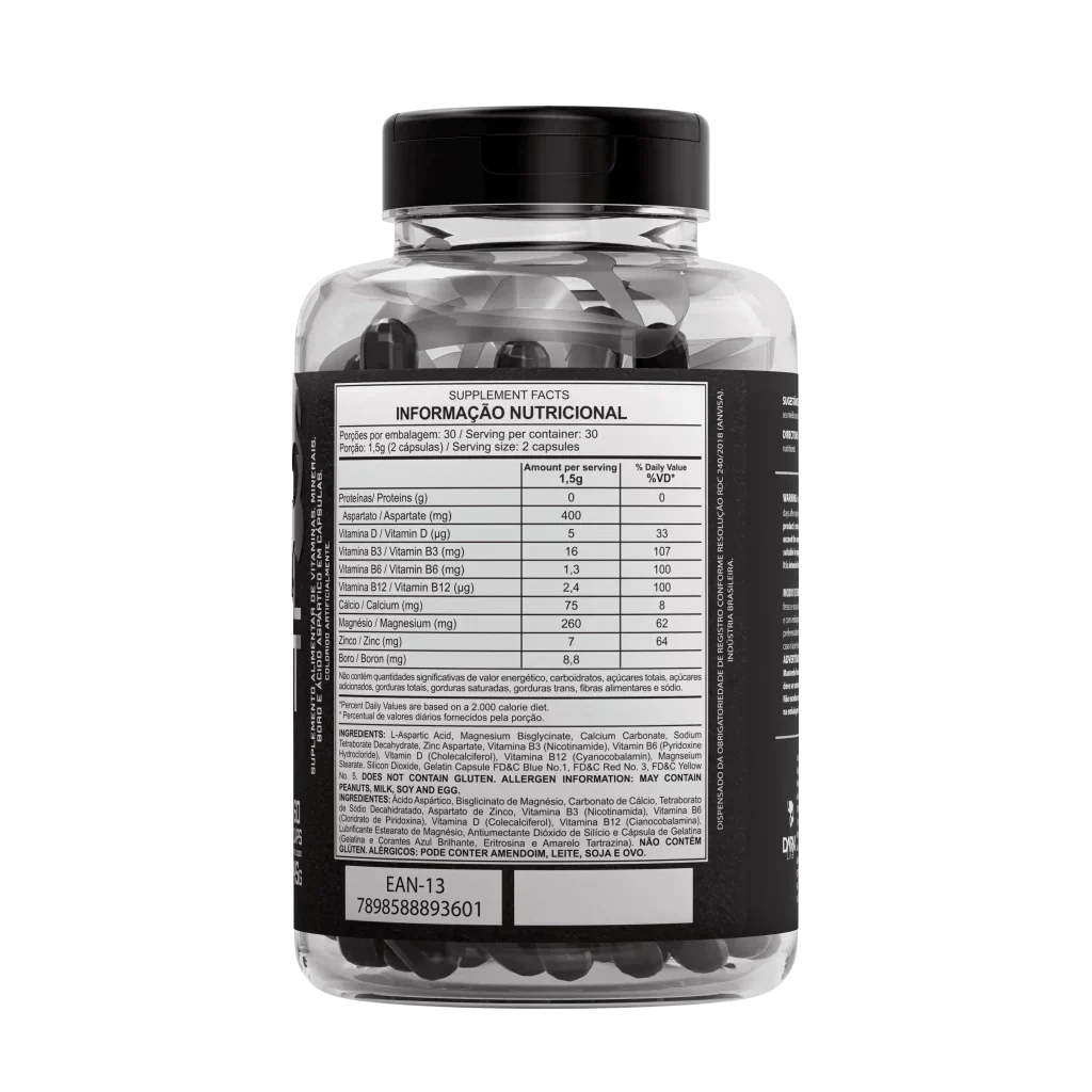 INGREDIENTES: Ácido aspártico, bisglicinato de magnésio, carbonato de cálcio, tetraborato de sódio decahidratado, asparto de zinco, vitamina B3 (nicotinamida), vitamina B6 (cloridrato de piridoxina), vitamina D (colecalciferol) vitamina B12 (cianocobalamina), lubrificante estearato de magnésio, antiumectante dióxido de silício e cápsula de gelatina (gelatina e corante azul brilhante, eritrosina e amarelo tartrazina). NÃO CONTÉM GLÚTEN.